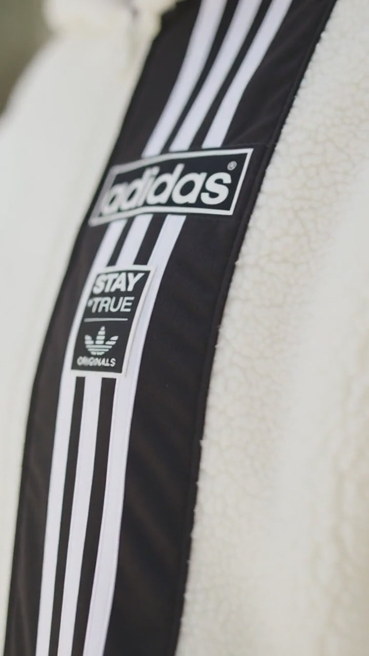 Sul davanti presenta una zip centrale e una striscia verticale nera che corre dal collo all’orlo, decorata con le iconiche tre strisce Adidas e il logo con il trifoglio ricamato nella parte superiore, donando un tocco distintivo e riconoscibile.